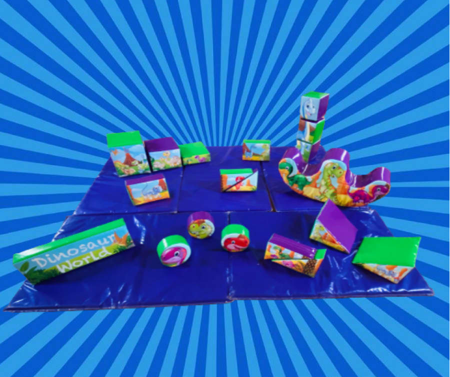 The dinosaur soft play hire includes a 17 piece set of glossy foam shapes with a double rocker. Safety mats are included with each soft play hire. These mats are designed to protect children from falls and ensure they stay safe while playing. Our soft play is suitable for ages 0 to 4